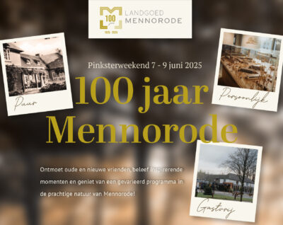 In juni 2025 bestaat Mennorode, ooit opgericht als Doopsgezind Broederschapshuis, precies 100 jaar. Dit vieren we graag samen met zoveel mogelijk Doopsgezinden tijdens een feestelijk en verbindend Pinksterweekend in Elspeet van zaterdag 7 juni tot en met maandag 9 juni 2025.